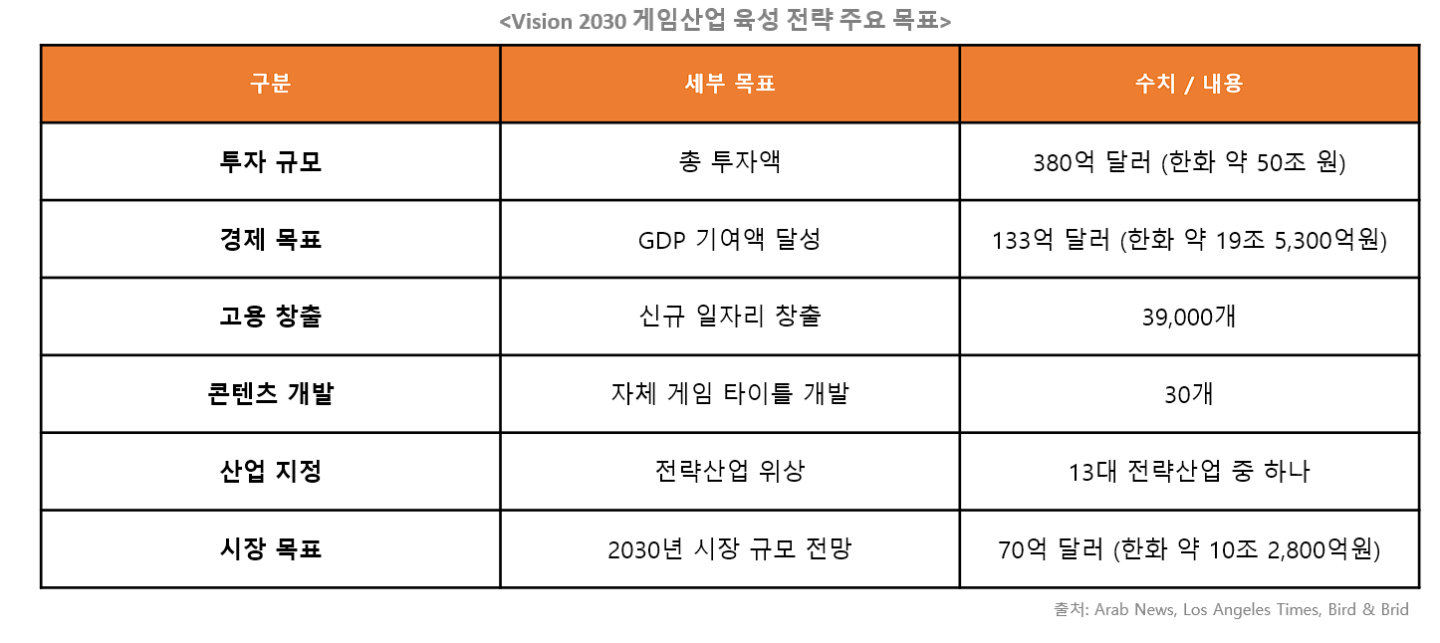 - 사우디의 게임산업 육성 전략은 구체적인 수치 목표를 동반하여 2030년까지 39,000개의 신규 일자리를 창출하고, 게임산업의 GDP 기여액을 133억 달러 (한화 약 19조 5,300억원) 수준으로 끌어올린다는 계획임