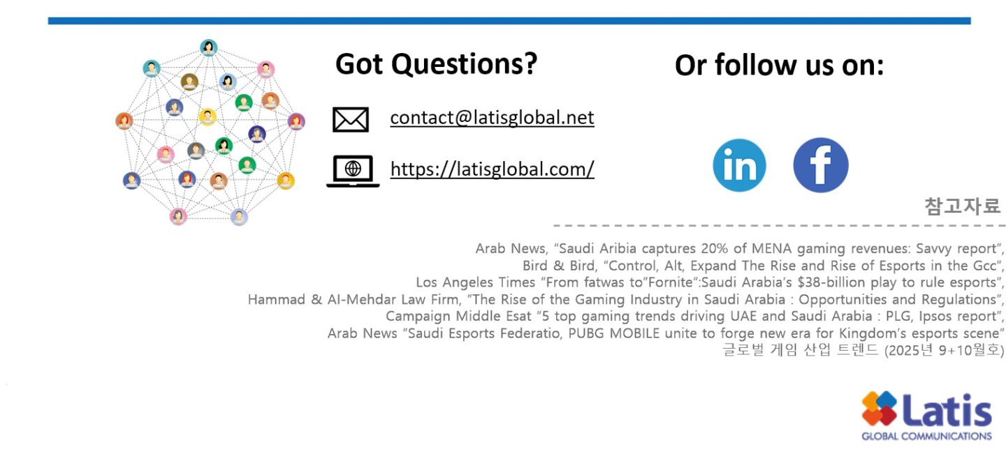 - 예컨대 사우디는 단순한 단일 시장이 아니라, 중동 전역을 공략하기 위한 전략적 거점이자 한국 게임산업의 새로운 성장 동력이 될 수 있는 핵심 시장임