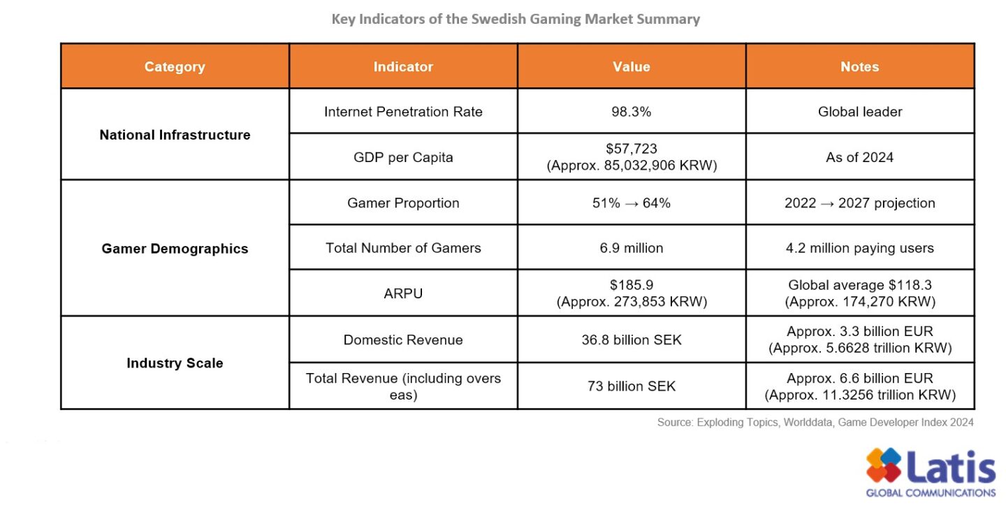 - Swedish gamers’ ARPU stands at $185.9 (approximately 270,000 KRW), significantly exceeding the global average of $118.3 (approximately 170,000 KRW)