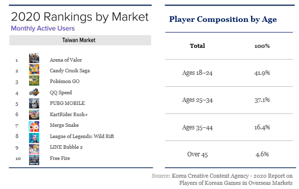which shows that the Taiwanese gaming market is driven by younger players - High average revenue per user and high tolerance for paid content leads to a market structure